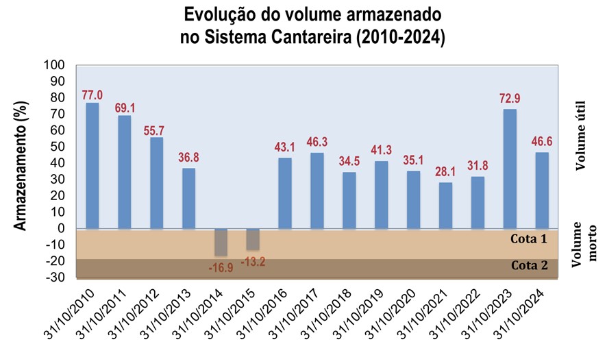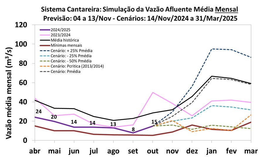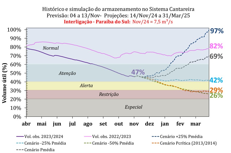 Salienta-se que, para o cenário de precipitação igual a média histórica, entre novembro de 2024 a março de 2025, o volume armazenado no Sistema Cantareira, no final do horizonte de projeção (março de 2025), estaria em uma faixa de operação superior à atual, porém em um patamar menor comparativamente ao registado no mesmo período de 2023 (82%).