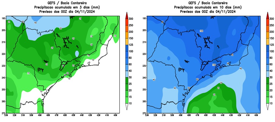 - Figura 4. Previsão de precipitação acumulada em milímetros (mm) nos próximos 3 (esquerda) e 10 (direita) dias para a bacia de captação do Sistema Cantareira, segundo a previsão do modelo numérico GENS/NOAA. A área da bacia de captação do Sistema Cantareira é indicada no centro da figura com linha preta espessa.