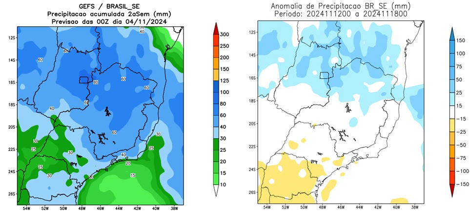 A região da bacia de captação do Sistema Cantareira está, desde meados de outubro, em fase de transição para a estação chuvosa, caracterizada por precipitações mais frequentes e volumosas. Especificamente, para os próximos 10 dias (Figura 4), as previsões do modelo GEFS/NOAA (50x50 km) indicam chuvas relativamente constantes e intensas, com acumulados totais próximos ou superiores aos valores médios. Para a segunda semana (Figura 5), espera-se uma redução tanto no volume quanto na frequência das chuvas em comparação com a primeira semana.