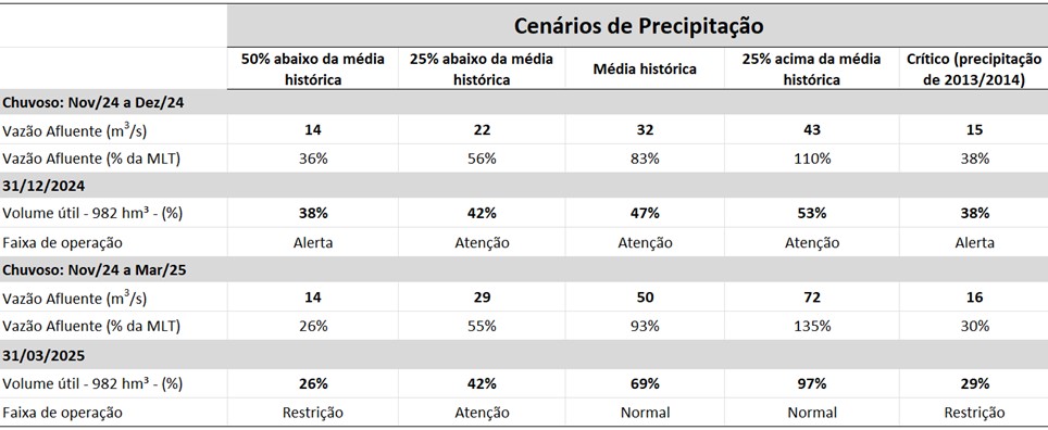 - Tabela 01. Projeções de vazões médias entre o período de novembro de 2024 a março de 2025 e volume armazenado no final de dezembro de 2024 e março de 2025, considerando cinco cenários de precipitação: 50% e 25% abaixo da média histórica, na média histórica e 25% acima da média histórica e cenário crítico. As faixas de operação do reservatório estão de acordo com a resolução conjunta da ANA/DAEE Nº 925/2017. Nessas simulações, foi considerado o aporte proveniente da interligação do Sistema Paraíba do Sul para Sistema Cantareira em novembro de 2024, de acordo com a Resolução conjunta ANA 1.931/17 e o Ofício OA 008/2024.