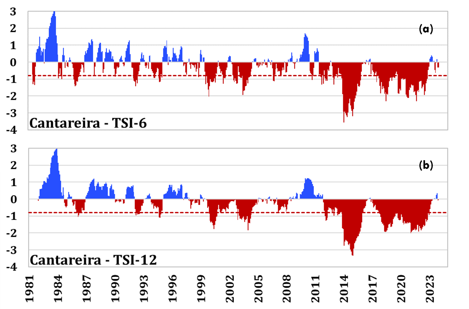 No mês de janeiro de 2024, a precipitação acumulada foi de 266 mm (2652 mm), equivalente a um valor de, aproximadamente, 101% (101%2) da média histórica para este mês (262 mm). O Sistema Cantareira encontra-se classificado em condição de normalidade em relação a seca hidrológica, de acordo com o Índice Padronizado Bivariado Precipitação-Vazão (TSI) para as escalas temporais de 6 e 12 meses (TSI-6 = -0,31; TSI-12 = -0,04) (Figura 2a e 2b).). Ainda de acordo com o TSI, a atual condição no Sistema Cantareira representa uma estabilidade em relação ao mês anterior. Ressalta-se que, apesar da condição atual de normalidade que se repete desde março de 2023, o Sistema Cantareira enfrentou condições de seca hidrológica crítica, variando de fraca a excepcional, desde o início de 2012 (à exceção dos meses entre maio de 2016 e maio de 2017).