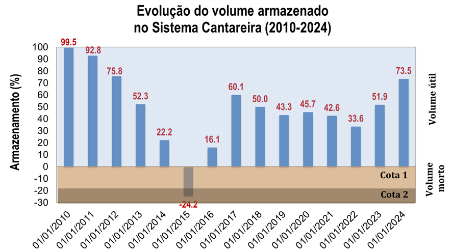 - Figura 3. Evolução do volume armazenado (%) nos reservatórios do Sistema Cantareira para o dia 31 de janeiro, dos anos de 2010 a 2024.