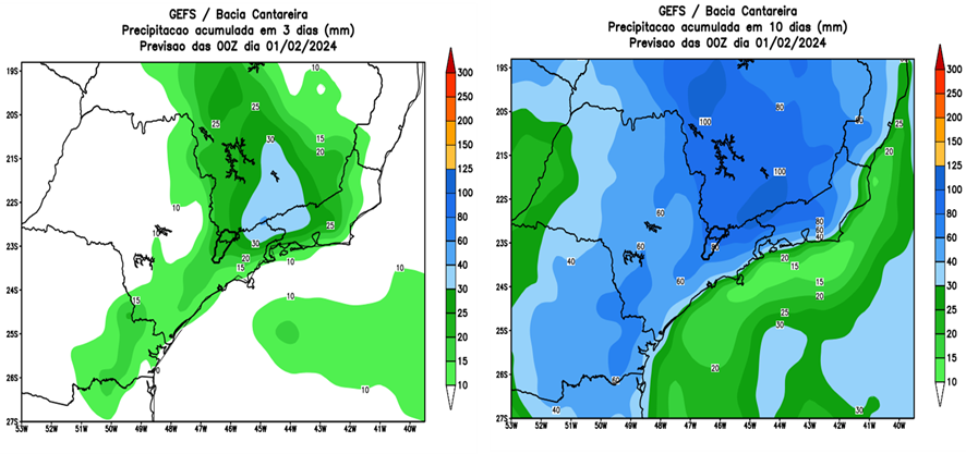- Figura 4. Previsão de precipitação acumulada em milímetros (mm) nos próximos 3 (esquerda) e 10 (direita) dias para a bacia de captação do Sistema Cantareira, segundo a previsão do modelo numérico GENS/NOAA. A área da bacia de captação do Sistema Cantareira é indicada no centro da figura com linha preta espessa.