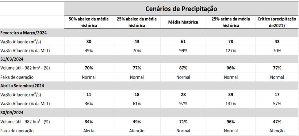As simulações indicam que, no cenário de chuva na média histórica, a vazão afluente média nos últimos dois meses chuvosos de 2024, fevereiro e março, seria em torno de 61 m³/s, o que representa 99% da média histórica para este período. Adicionalmente, para os cenários de precipitações 25% e 50% abaixo da média histórica, as simulações projetam vazões da ordem de 43 m3/s (70%) e 30 m3/s (49%), respectivamente. Além disso, no cenário de precipitação crítica, ocorrido em 2021, o modelo hidrológico aponta vazão média de 43 m3/s, correspondente a 70% da média do período. Por outro lado, em um cenário de chuvas 25% acima da média histórica, o modelo indica vazão média de 78 m3/s, equivalente a 27% acima da média histórica deste período. Um resumo de tais valores também podem ser visualizado na Tabela 1.