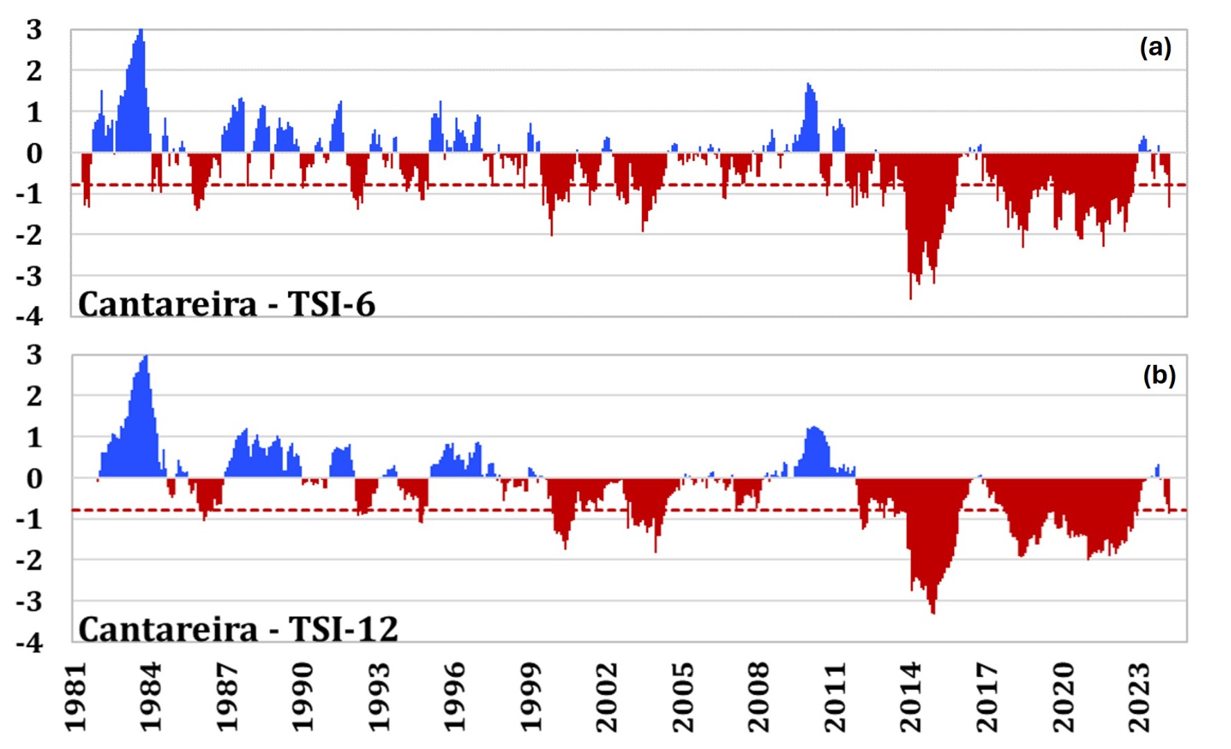 - Figura 2. Índice Padronizado Bivariado Precipitação-Vazão (TSI) para o Sistema Cantareira, nas escalas temporais de 6 e 12 meses, entre janeiro de 1981 a abril de 2024. A linha vermelha pontilhada indica o limiar entre uma condição de seca hidrológica fraca e moderada à excepcional.