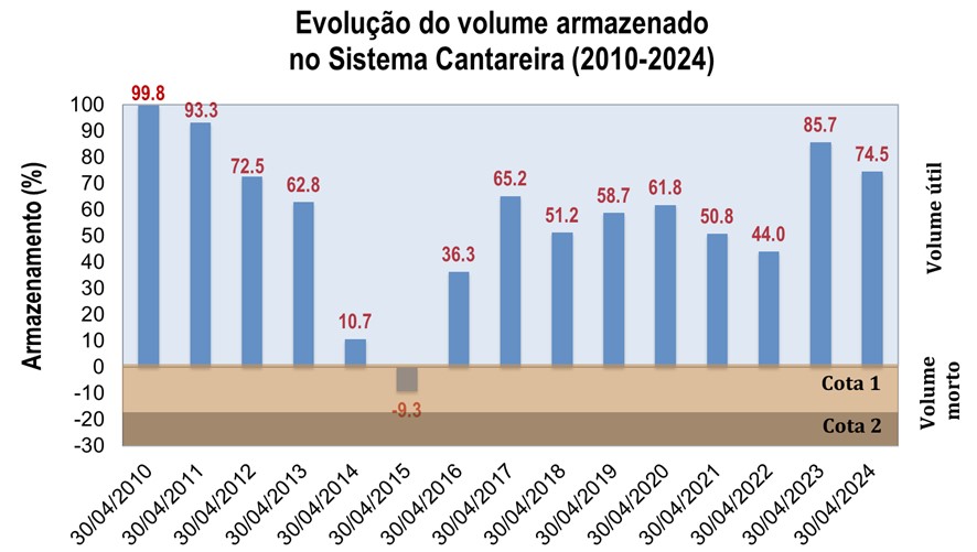 - Figura 3. Evolução do volume armazenado (%) nos reservatórios do Sistema Cantareira para o final do mês de abril, entre os anos de 2010 e 2024.