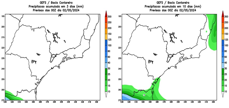 - Figura 4. Previsão de precipitação acumulada em milímetros (mm) nos próximos 3 (esquerda) e 10 (direita) dias para a bacia de captação do Sistema Cantareira, segundo a previsão do modelo numérico GENS/NOAA. A área da bacia de captação do Sistema Cantareira é indicada no centro da figura com linha preta espessa.