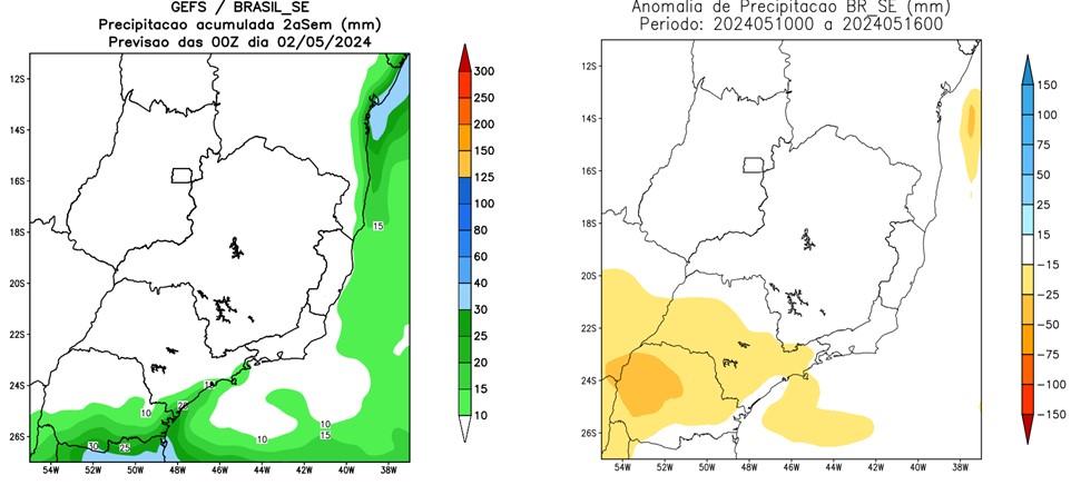 A região da bacia de captação do Sistema Cantareira se encontra atualmente no início do período seco, caraterizado por chuvas escassas que ocorrem basicamente em decorrência da passagem de sistemas frontais. Tanto para os próximos 10 dias (Figura 4) quanto para a segunda semana (Figura 5) as previsões baseadas no modelo GENS/NOAA (50x50 km) apontam a ausência de precipitações significativas na bacia.