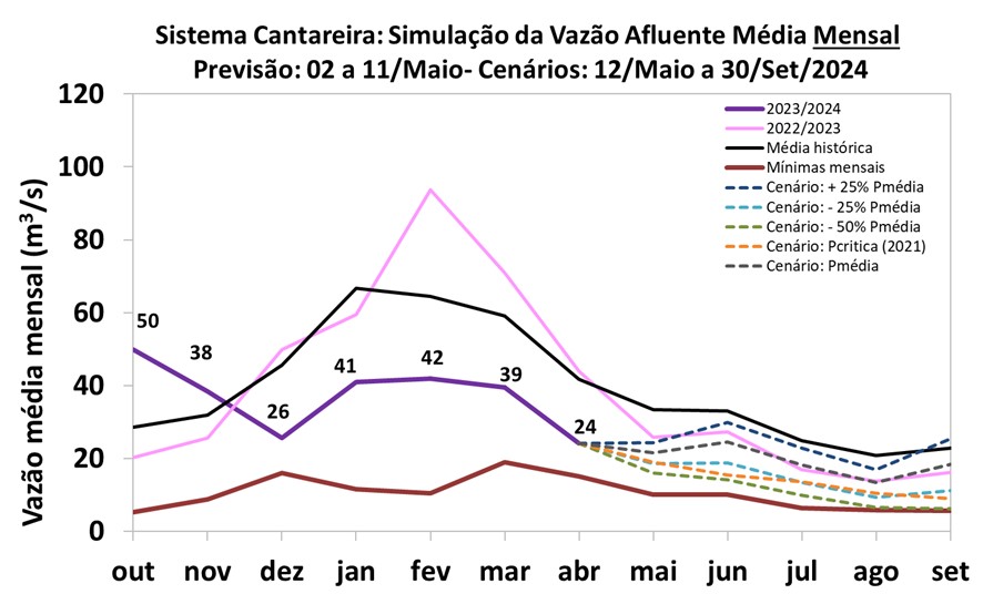 - Figura 6. Histórico (linhas contínuas) e simulação de vazão média mensal (em m³/s) afluente ao Sistema Cantareira (linhas tracejadas) considerando a previsão e cinco cenários de precipitação: 50% (verde) e 25% abaixo da média histórica (azul claro); na média histórica (cinza) e 25% acima da média histórica (azul escuro) e cenário crítico (laranja). As linhas espessas representam as vazões médias mensais observadas, de acordo com a SABESP: média histórica (preto); mínimos mensais (marrom); série de outubro de 2022 a setembro de 2023 (magenta); e série de outubro de 2023 a abril de 2024 (roxo).