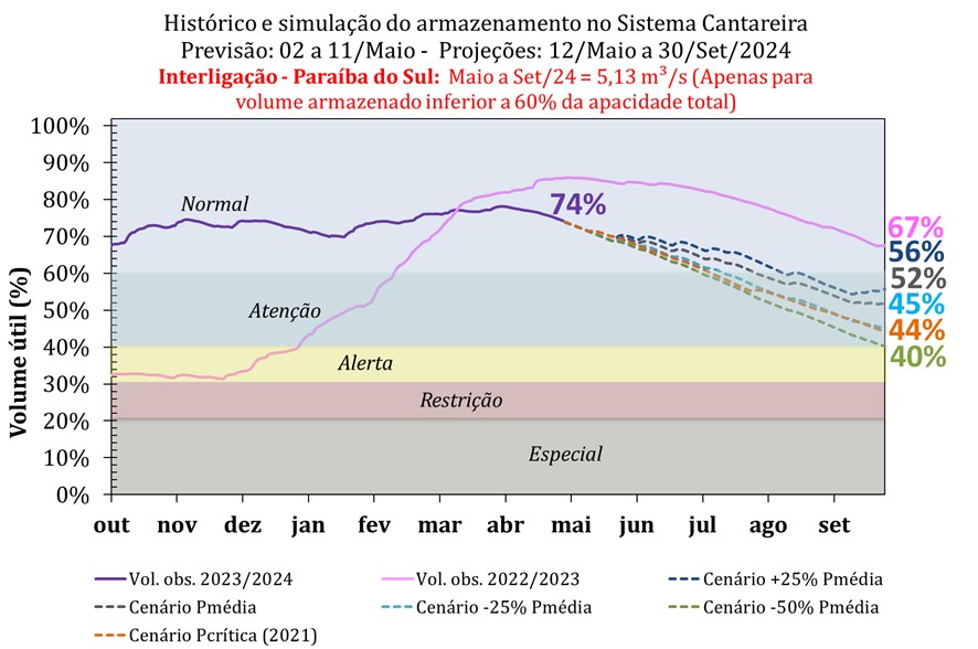 Salienta-se que, em todos os cenários de precipitação, entre maio e setembro de 2024, o volume armazenado no Sistema Cantareira, no final do horizonte de projeção, estaria em uma faixa de operação inferior à atual, e alcançaria um patamar menor ao registado no mesmo período de 2023 (67%).