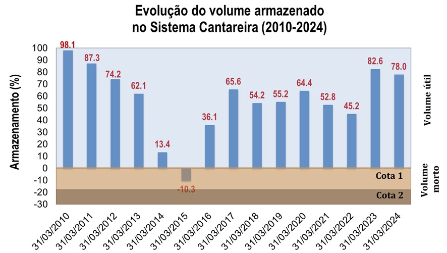 A média de vazão afluente aos reservatórios do Sistema Cantareira (Sistema Equivalente + Paiva Castro), nos meses chuvosos de 2023/2024, entre outubro de 2023 e março de 2024, de acordo com dados da SABESP[3] e da ANA[4] foi, de aproximadamente, 39 m3/s. Esse valor corresponde a, aproximadamente, 80% da média histórica para a estação chuvosa (49 m3/s). Para o mesmo período, a extração total média dos reservatórios foi 33 m³/s, enquanto a média de extração de água do Sistema Cantareira para o elevatório Santa Inês (Qesi), que abastece a região metropolitana de São Paulo, foi 28 m³/s.