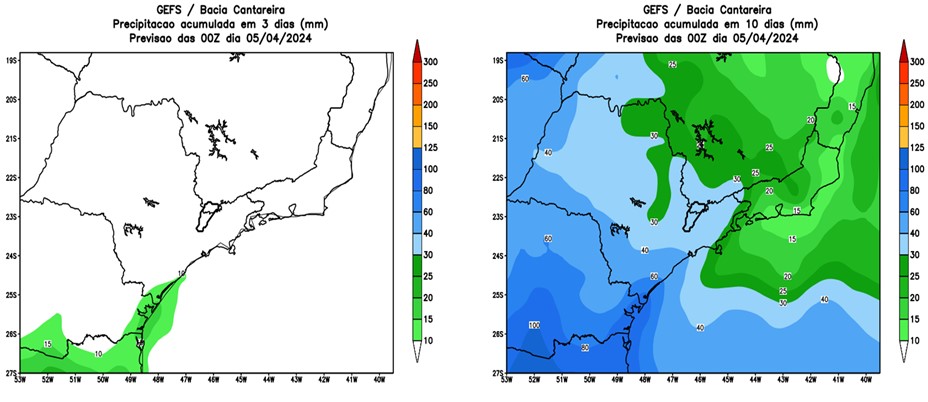 - Figura 4. Previsão de precipitação acumulada em milímetros (mm) nos próximos 3 (esquerda) e 10 (direita) dias para a bacia de captação do Sistema Cantareira, segundo a previsão do modelo numérico GENS/NOAA. A área da bacia de captação do Sistema Cantareira é indicada no centro da figura com linha preta espessa.