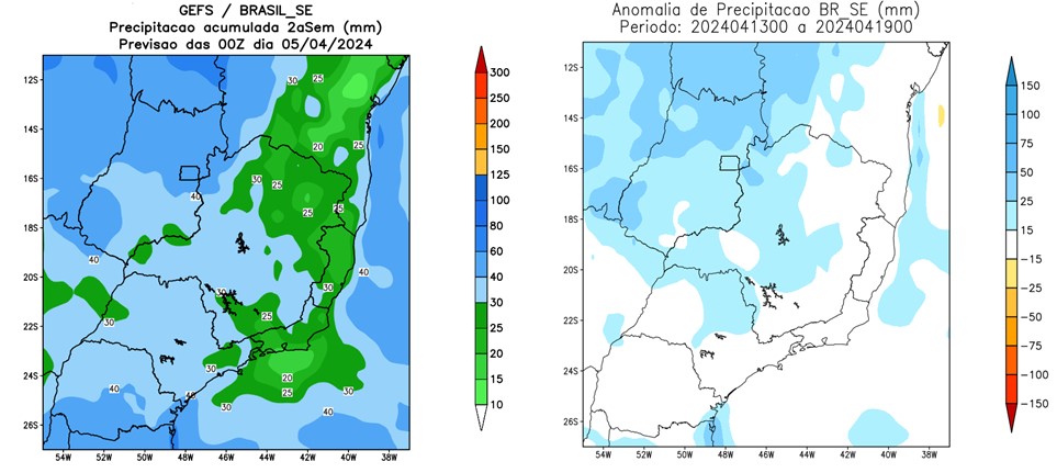 A região da bacia de captação do Sistema Cantareira já se encontra no período de transição entre a estação chuvosa e a estação seca, onde as chuvas se tornam menos abundantes e frequentes. Em particular, para os próximos 10 dias (Figura 4) as previsões baseadas no modelo GENS/NOAA (50x50 km) apontam ocorrência de algumas precipitações na bacia, com volumes totais que estarão, provavelmente, próximos dos valores médios da época. A tendência para a segunda semana (Figura 5), também aponta a ocorrência de chuvas com volumes totais próximos à média histórica.