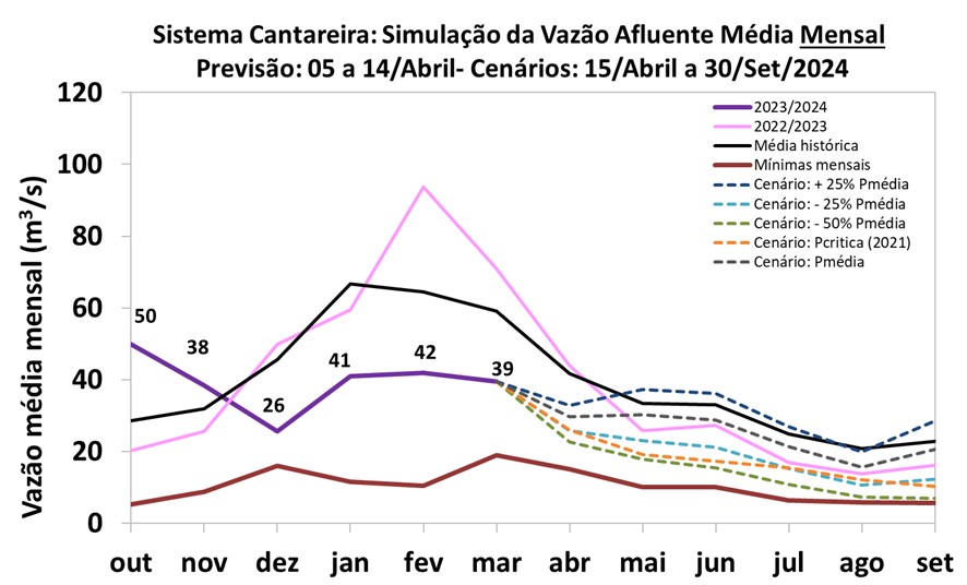 Com relação às projeções hidrológicas a partir do modelo PDM/CEMADEN (Probability-Distributed Model/CEMADEN) (Tabela 01), as simulações indicam que, no cenário hipotético de precipitação na média histórica, a vazão afluente média aos reservatórios do sistema Cantareira, no próximo trimestre, de abril a junho de 2024, seria 30 m³/s, o que representa 82% da média histórica para este período. Ainda, considerando o cenário de precipitações na média histórica, o modelo hidrológico projeta um armazenamento no sistema, no final de junho, de 71%, na faixa de operação “Normal”. Para um horizonte de tempo maior, entre abril e setembro, o modelo indica vazão média de 24 m³/s, correspondente a 83% da média histórica e armazenamento no final de setembro, de 57%, na faixa de operação “Atenção”.