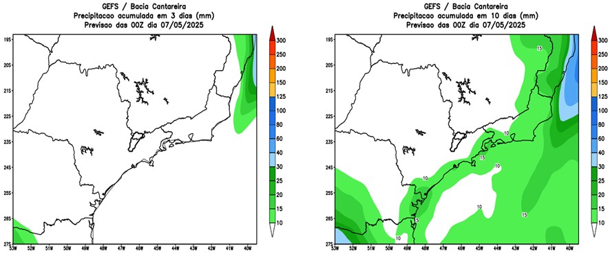 - Figura 4. Previsão de precipitação acumulada em milímetros (mm) nos próximos 3 (esquerda) e 10 (direita) dias para a bacia de captação do Sistema Cantareira, segundo a previsão do modelo numérico GENS/NOAA. A área da bacia de captação do Sistema Cantareira é indicada no centro da figura com linha preta espessa.