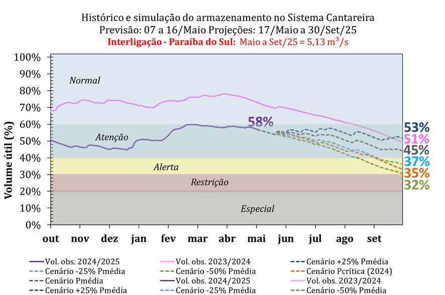 Ressalta-se que, considerando um cenário de precipitação igual à média histórica entre maio e setembro de 2025, o volume armazenado no Sistema Cantareira, ao final do horizonte de projeção (30 de setembro de 2025), permaneceria na mesma faixa de operação atual — "Atenção" —, porém em um patamar inferior ao registrado no mesmo período de 2024, quando atingiu 51%.