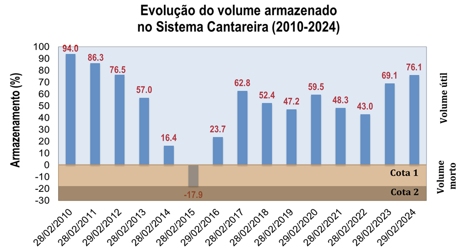 - Figura 3. Evolução do volume armazenado (%) nos reservatórios do Sistema Cantareira para o final do mês de fevereiro, dos anos de 2010 a 2024.