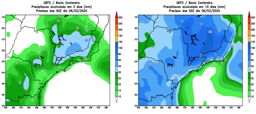 - Figura 4. Previsão de precipitação acumulada em milímetros (mm) nos próximos 3 (esquerda) e 10 (direita) dias para a bacia de captação do Sistema Cantareira, segundo a previsão do modelo numérico GENS/NOAA. A área da bacia de captação do Sistema Cantareira é indicada no centro da figura com linha preta espessa.