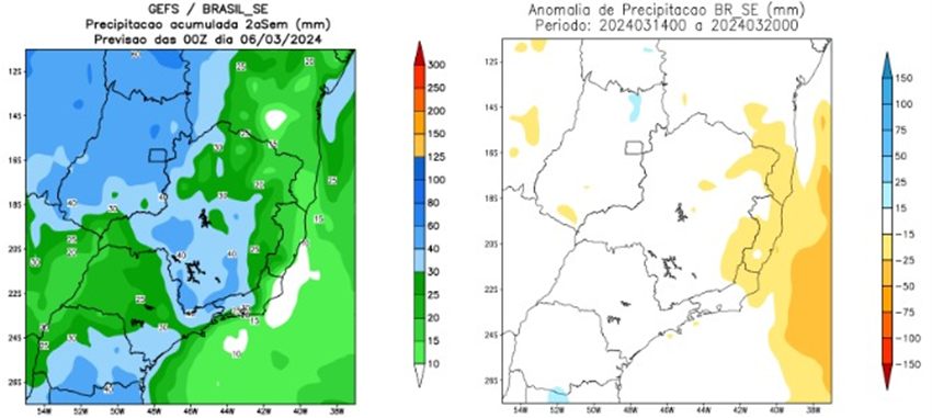 - Figura 5. Previsão de precipitação em milímetros (mm) acumulados (esquerda) e sua respectiva anomalia em relação aos valores climatológicos (direita) para a segunda semana de acordo com o modelo numérico GENS/NOAA.