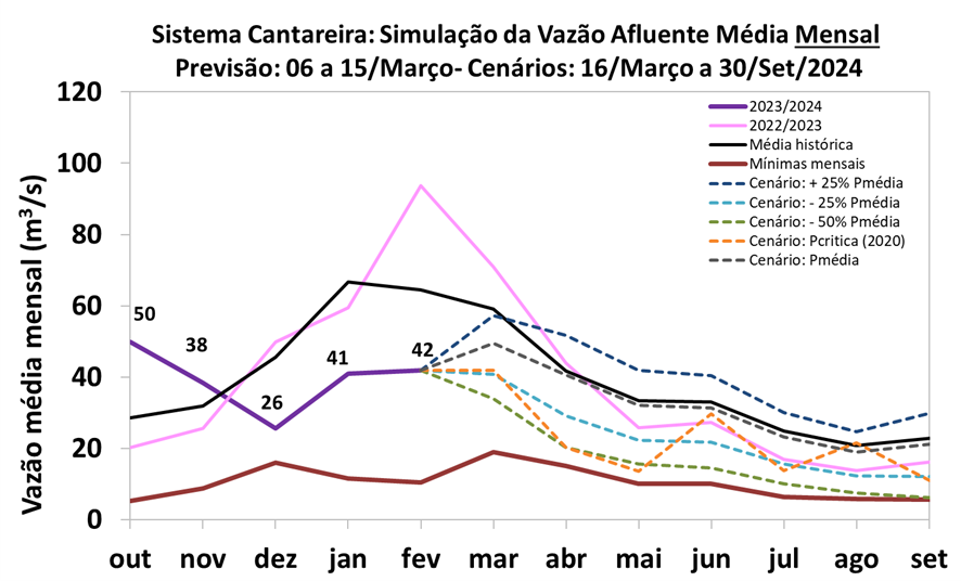 A média de vazão afluente aos reservatórios do Sistema Cantareira (Sistema Equivalente + Paiva Castro), nos meses chuvosos de 2023/2024, entre outubro de 2023 e fevereiro de 2024, de acordo com dados da SABESP[3] e da ANA[4] foi, de aproximadamente, 39 m3/s. Esse valor corresponde a, aproximadamente, 83% da média histórica deste período (47 m3/s) e 80% da média histórica para a estação chuvosa (49 m3/s). Para o mesmo período, a extração total média dos reservatórios foi 33 m³/s, enquanto a média de extração de água do Sistema Cantareira para o elevatório Santa Inês (Qesi), que abastece a região metropolitana de São Paulo, foi 28 m³/s.