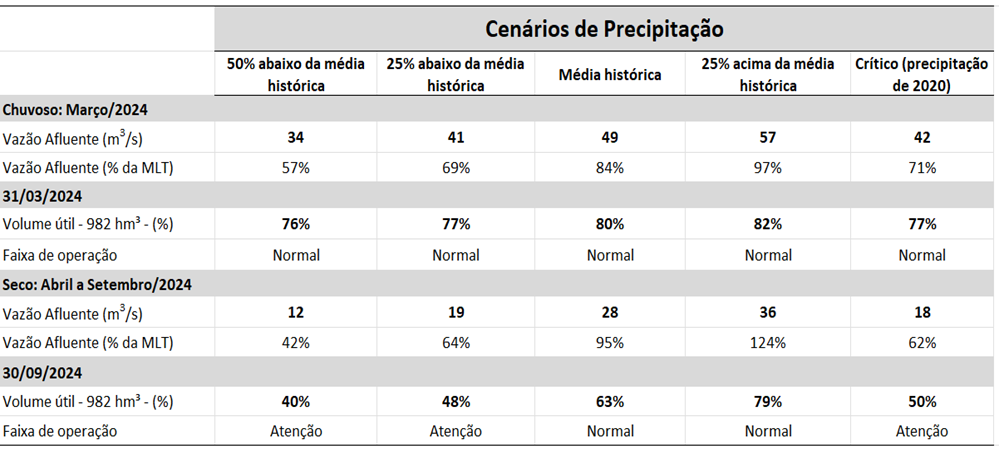 As simulações indicam que, no cenário de chuva na média histórica, a vazão afluente média no último mês da estação chuvosa de 2024, março, seria em torno de 49 m³/s, o que representa 84% da média histórica para este período. Adicionalmente, para os cenários de precipitações 25% e 50% abaixo da média histórica, as simulações projetam vazões da ordem de 41 m3/s (69%) e 34 m3/s (57%), respectivamente. Além disso, no cenário de precipitação crítica, ocorrido em 2020, o modelo hidrológico aponta vazão média de 42 m3/s, correspondente a 71% da média do período. Por outro lado, em um cenário de chuvas 25% acima da média histórica, o modelo indica vazão média de 57 m3/s, equivalente a 97% da média histórica deste período. Um resumo de tais valores também podem ser visualizado na Tabela 1.