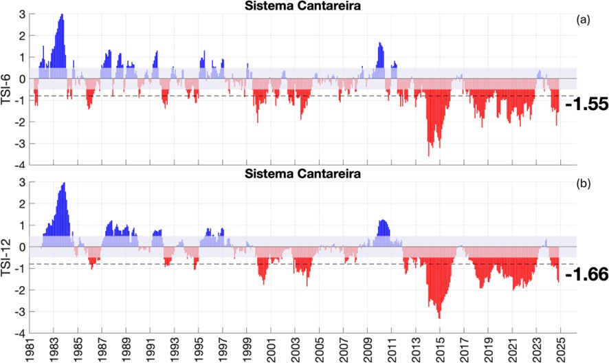O Sistema Cantareira encontra-se classificado em condição de seca hidrológica variando entre severa e extrema, de acordo com o Índice Padronizado Bivariado Precipitação-Vazão (TSI) para as escalas temporais de 6 e 12 meses (TSI-6 = -1,55; TSI-12 = -1,66, respectivamente) (Figura 2a e 2b). Ainda de acordo com o TSI, em relação ao mês anterior, a seca no Sistema Cantareira agravou-se na escala de 12 meses, classificada como hidrológica severa em outubro, enquanto na escala de 6 meses permaneceu estável. Destaca-se que, embora a bacia tenha apresentado condições de normalidade entre março de 2023 e fevereiro de 2024, o Sistema Cantareira enfrenta uma seca hidrológica crítica desde o início de 2012, com intensidade variando de fraca a excepcional, exceto no período entre maio de 2016 e maio de 2017.