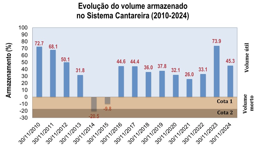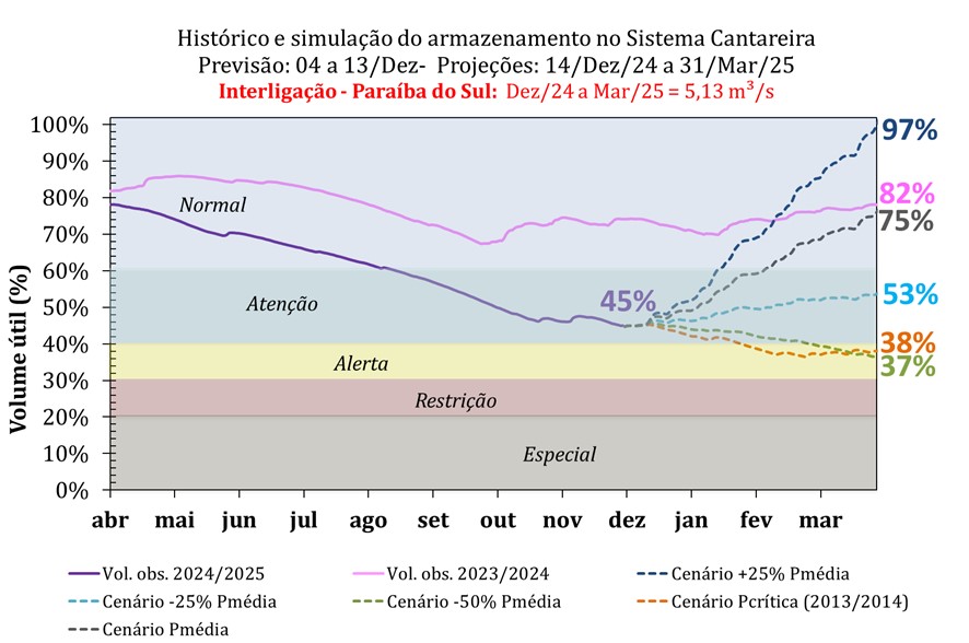 Salienta-se que, para o cenário de precipitação igual a média histórica, entre dezembro de 2024 a março de 2025, o volume armazenado no Sistema Cantareira, no final do horizonte de projeção (março de 2025), estaria em uma faixa de operação superior à atual, porém em um patamar inferior comparativamente ao registado no mesmo período de 2023 (82%).