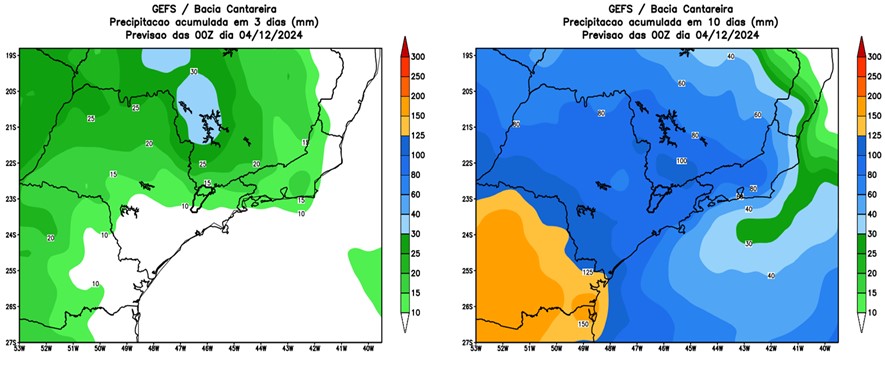 - Figura 4. Previsão de precipitação acumulada em milímetros (mm) nos próximos 3 (esquerda) e 10 (direita) dias para a bacia de captação do Sistema Cantareira, segundo a previsão do modelo numérico GENS/NOAA. A área da bacia de captação do Sistema Cantareira é indicada no centro da figura com linha preta espessa.