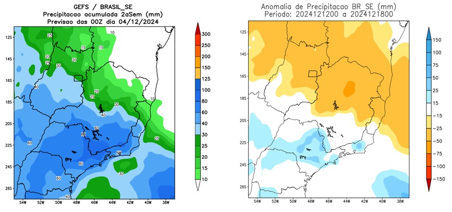 A região da bacia de captação do Sistema Cantareira já se encontra no período chuvoso, caracterizado por precipitações relativamente frequentes e volumosas. Especificamente para os próximos 10 dias (Figura 4), as previsões do modelo GEFS/NOAA (50x50 km) indicam chuvas predominantemente em forma de pancadas, com maior probabilidade de ocorrência durante a tarde e noite. Os acumulados totais previstos estão relativamente próximos aos valores médios para o período. Para a segunda semana (Figura 5), também são esperadas precipitações com volumes totais próximos à média histórica para esta época do ano.