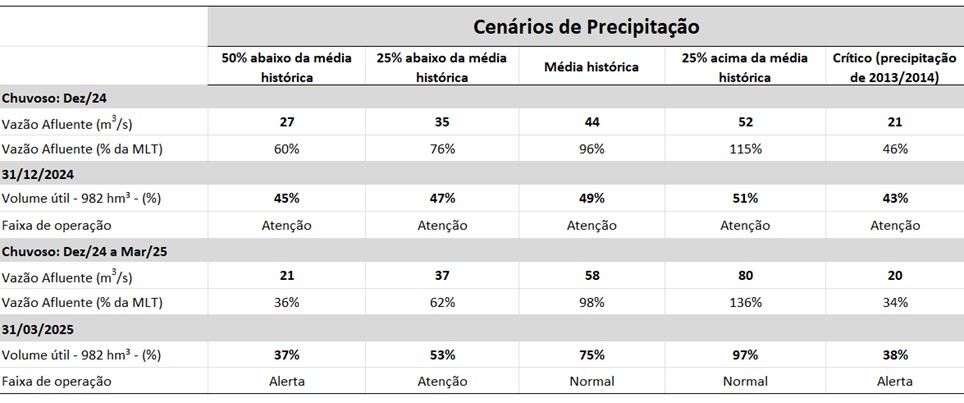 Considerando um cenário hipotético de precipitação na média histórica, por exemplo, as projeções indicam que, os reservatórios estariam no final do ano de 2024 (31 de dezembro), na faixa de operação “Atenção” (armazenamento entre 40% e 60%), com 49% do seu volume útil” (Tabela 01). Nos cenários de precipitação 25% e 50% abaixo da média, os reservatórios continuariam, no final de dezembro de 2024, na faixa de operação “Atenção”, com 47% e 45% do volume útil, respectivamente. Adicionalmente, para o cenário de precipitação crítica, igual ao ocorrido em 2013, o volume projetado pelo modelo hidrológico no final de dezembro de 2024 é de 43% da capacidade total do sistema, também na faixa de operação “Atenção”. Por fim, no cenário de chuvas mais otimista, 25% acima da média histórica, o modelo indica que os reservatórios permaneceriam até o final de dezembro de 2024 na faixa de operação “Atenção”, alcançando um valor de 51% da capacidade total.