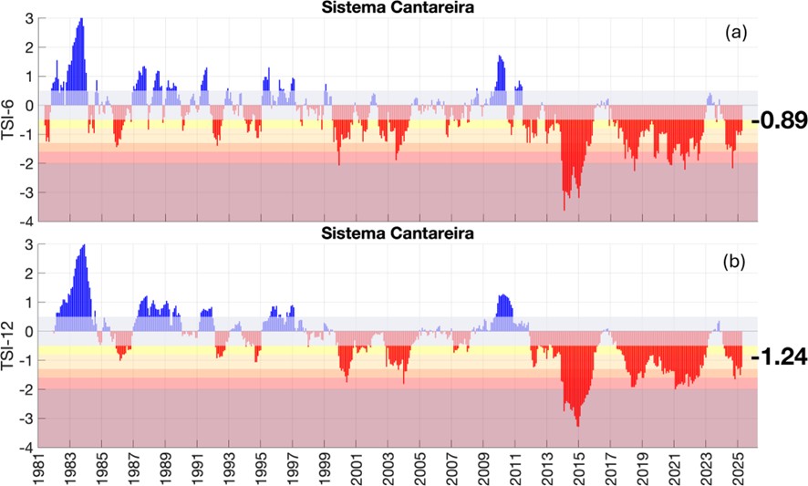- Figura 2. Índice de Seca Bivariado Precipitação-Vazão (TSI) para o Sistema Cantareira, nas escalas temporais de 6 (a) e 12 (b) meses, entre janeiro de 1981 a abril de 2025. As faixas coloridas indicam as categorias de seca hidrológica variando entre fraca à excepcional, na seguinte ordem: amarelo (fraca); bege (moderada); laranja (severa); vermelho (extrema) e bordô (excepcional).