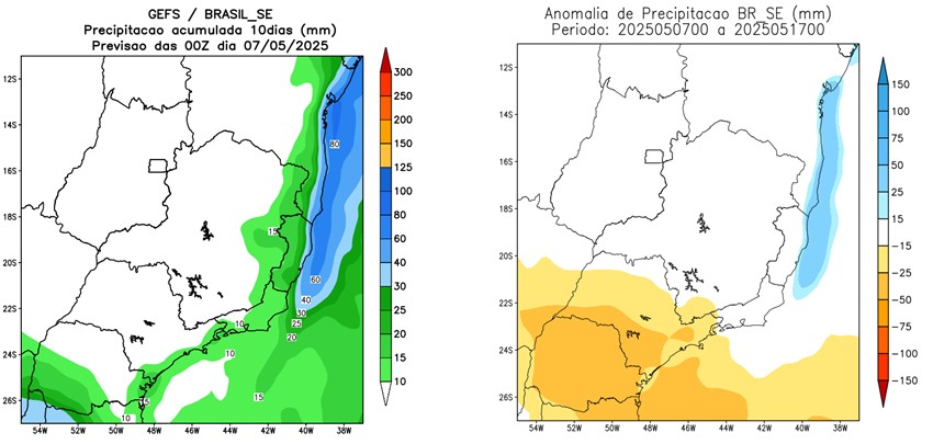 - Figura 4. Previsão de precipitação acumulada em milímetros (mm) nos próximos 3 (esquerda) e 10 (direita) dias para a bacia de captação do Sistema Cantareira, segundo a previsão do modelo numérico GENS/NOAA. A área da bacia de captação do Sistema Cantareira é indicada no centro da figura com linha preta espessa.