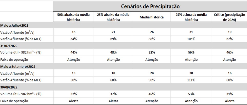 Considerando um horizonte de tempo maior, entre os meses secos de maio a setembro de 2025, de acordo com as projeções, para o cenário de chuva na média histórica, a vazão afluente ficará em torno de 24 m³/s, equivalente a 90% média histórica para este período. Nos cenários de precipitações 25% e 50% abaixo da média histórica, as simulações apontam vazões da ordem de 18 m³/s (68%) e 13 m³/s (50%) da média, respectivamente. No cenário de precipitação crítica igual ao ocorrido em 2024 (43% da média histórica), o modelo hidrológico aponta vazão média em torno de 16 m3/s, correspondente a 60% da média do período. Em um cenário de chuvas mais otimista, 25% acima da média histórica, o modelo projeta uma vazão média vazão de 30 m³/s, caracterizando um valor de 11% acima da média histórica deste período. Um resumo de tais valores também podem ser visualizado na Tabela 1.