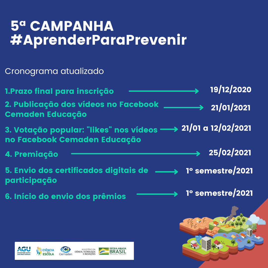 Todas as orientações e informações da 5ª edição da Campanha #AprenderParaPrevenir estão também disponibilizadas no site do Cemaden Educação: http://educacao.cemaden.gov.br/