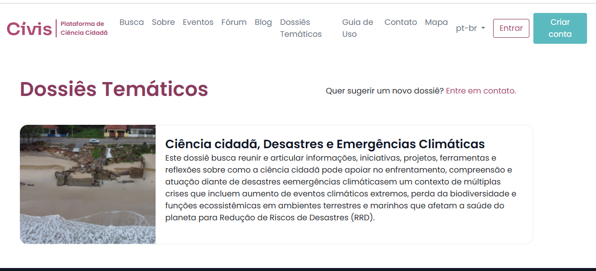 Para acessar do Dossiê Temático Ciência Cidadã, Desastres e Emergências Climáticas, : https://civis.ibict.br/dossiers/