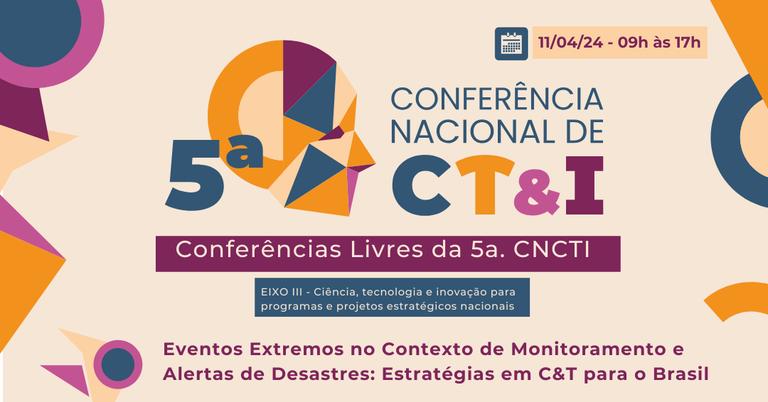 O Centro Nacional de Monitoramento e Alertas de Desastres Naturais (Cemaden) - Unidade de Pesquisa do Ministério da Ciência, Tecnologia e Inovação (MCTI) realizará, no dia 11 de abril, uma Conferência Livre para a 5ª Conferência Nacional de Ciência, Tecnologia e Inovação. O evento tem como tema "Eventos Extremos no Contexto de Monitoramento e Alertas de Desastres: Estratégias em C&T para o Brasil". O objetivo das conferências livres para a 5ª CNCTI é abordar temas, perspectivas e desafios para enriquecer a pauta da Conferência Nacional e contribuir para o aprimoramento de políticas públicas, tendo a ciência e a tecnologia como aliadas.