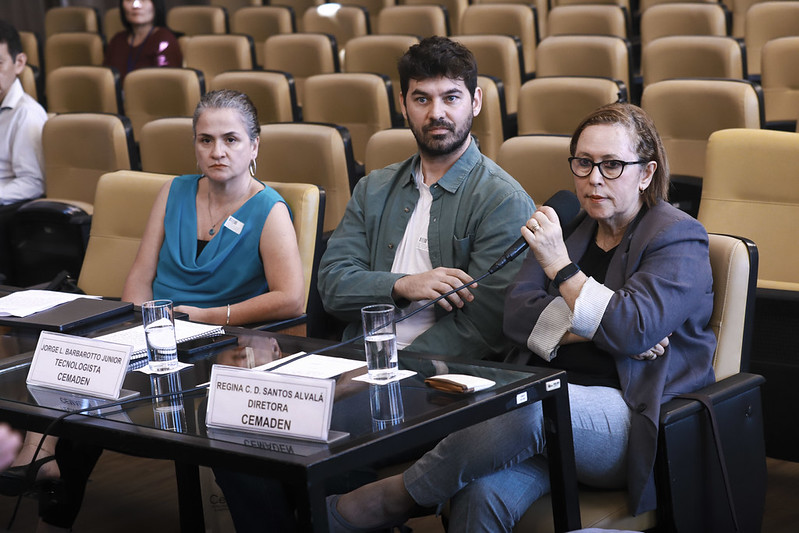 - Da esquerda para a direita: Luz Adriana Cuartas, pesquisadora; Jorge Barbarotto, tecnologista; e Regina Alvalá, diretora do CEMADEN. Foto: Lucas Bassi (Câmara Municipal de São Paulo).