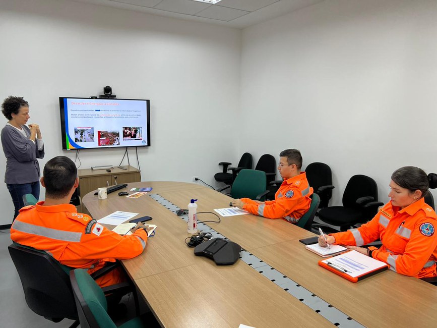 Conheceram o trabalho do Programa Cemaden Educação, apresentado pela pesquisadora Débora Olivato, que explicou sobre as ações preventivas e o desenvolvimento da percepção do risco para a redução dos riscos de desastres. A pesquisadora enfatizou o trabalho realizado, especialmente, com a comunidade escolar, envolvendo alunos e professores, além da parceria junto às defesas civis, universidades e organizações sociais. Aproveitou para convidar a corporação de MG a participar da 7ª Campanha #AprenderParaPrevenir, no compartilhamento das práticas em defesa civil e prevenção.