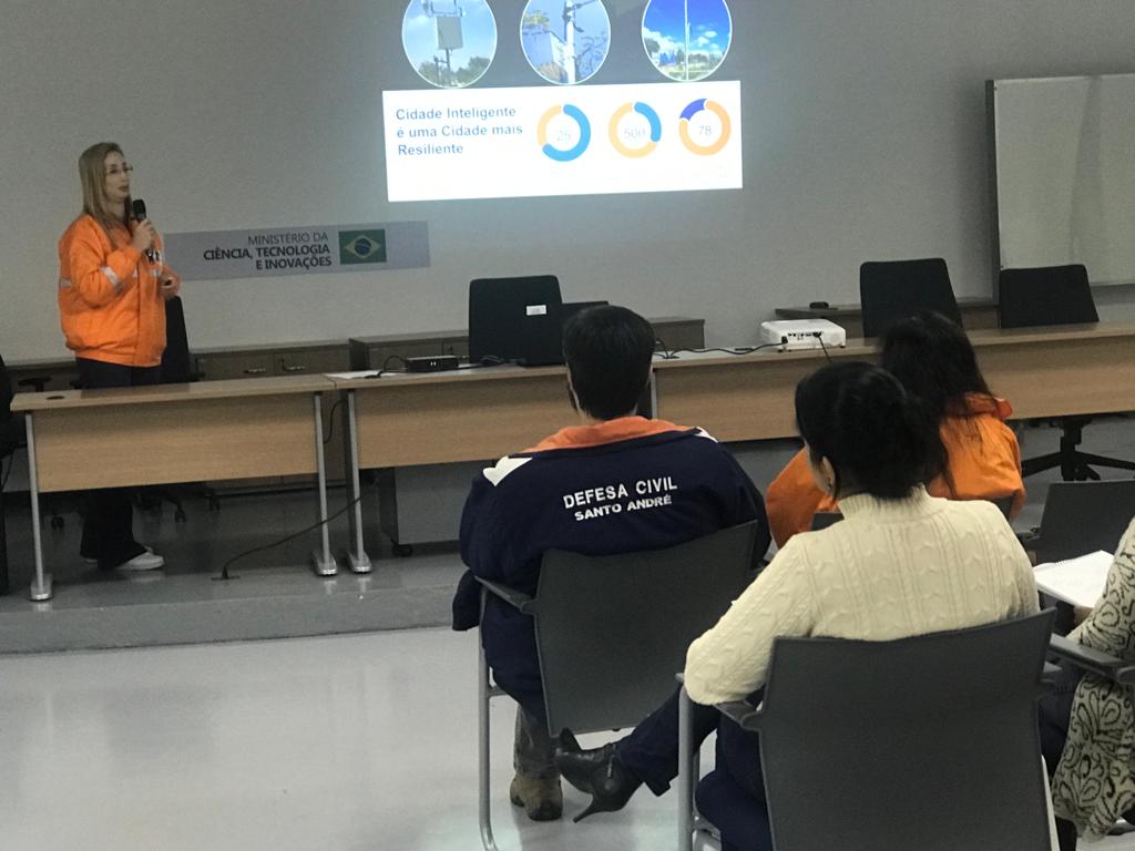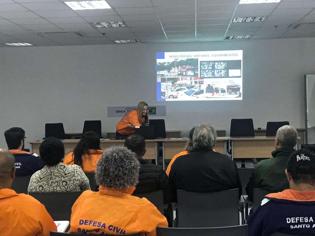 No auditório do Cemaden, a diretora da Defesa Civil de Santo André, Priscila de Oliveira, fez a apresentação institucional aos pesquisadores e tecnologistas do Cemaden, mostrando o panorama sobre o município e a reestruturação da Defesa Civil Municipal, integrada pela Secretaria de Infraestrutura e Serviços Urbanos. A Defesa Civil de Santo André é a segunda mais antiga do Estado de São Paulo, com 47 anos de existência. Abordou sobre os investimentos em equipamentos, sistemas de dados, modelagens e simulações para o monitoramento e prevenção de riscos de desastres. Informou, também, sobre a realização de um novo mapeamento de áreas de risco no município a ser realizado pelo Instituto de Pesquisas Tecnológicos (IPT).