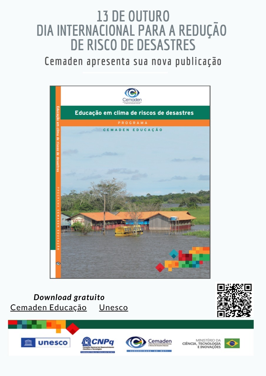 Em contribuição à data internacional, o Cemaden/MCTI apresenta o livro “Educação em clima de riscos de desastres”. A nova publicação, elaborada em cooperação com a Unesco do Brasil, reúne marcos conceituais de desastres, políticas públicas nacionais e internacionais, conhecimentos e práticas que orientam os trabalhos e pesquisas do Programa Cemaden Educação.
