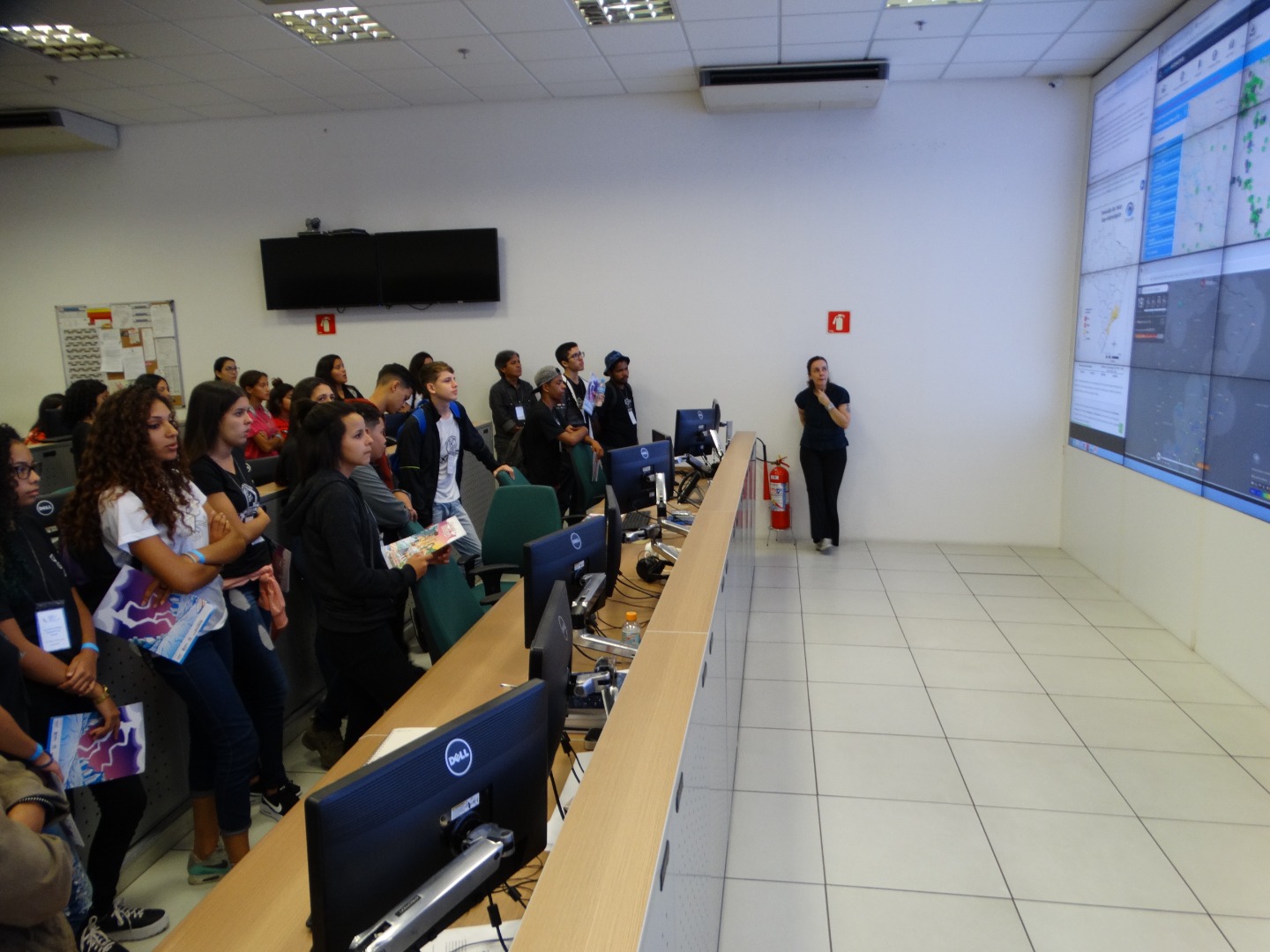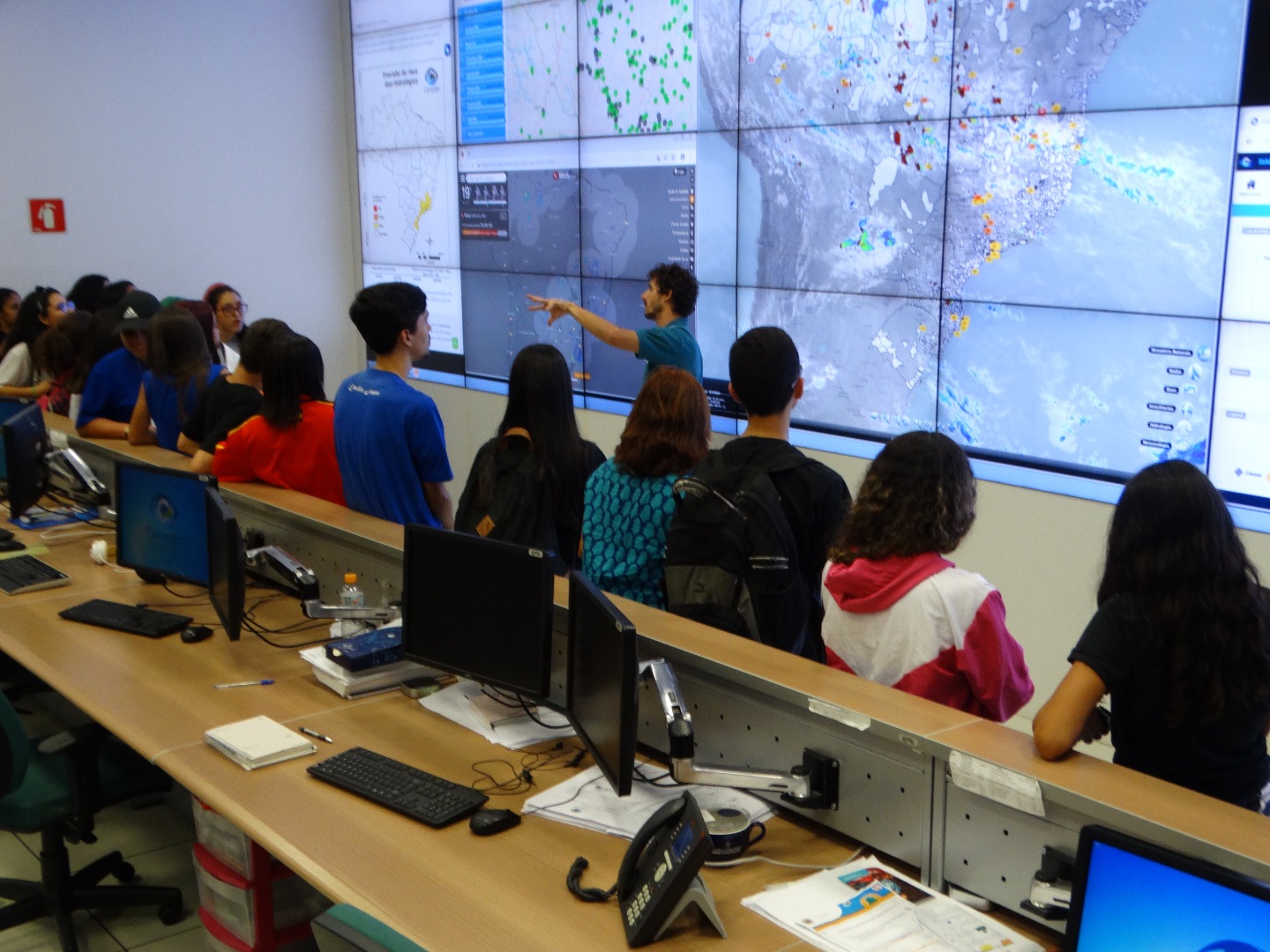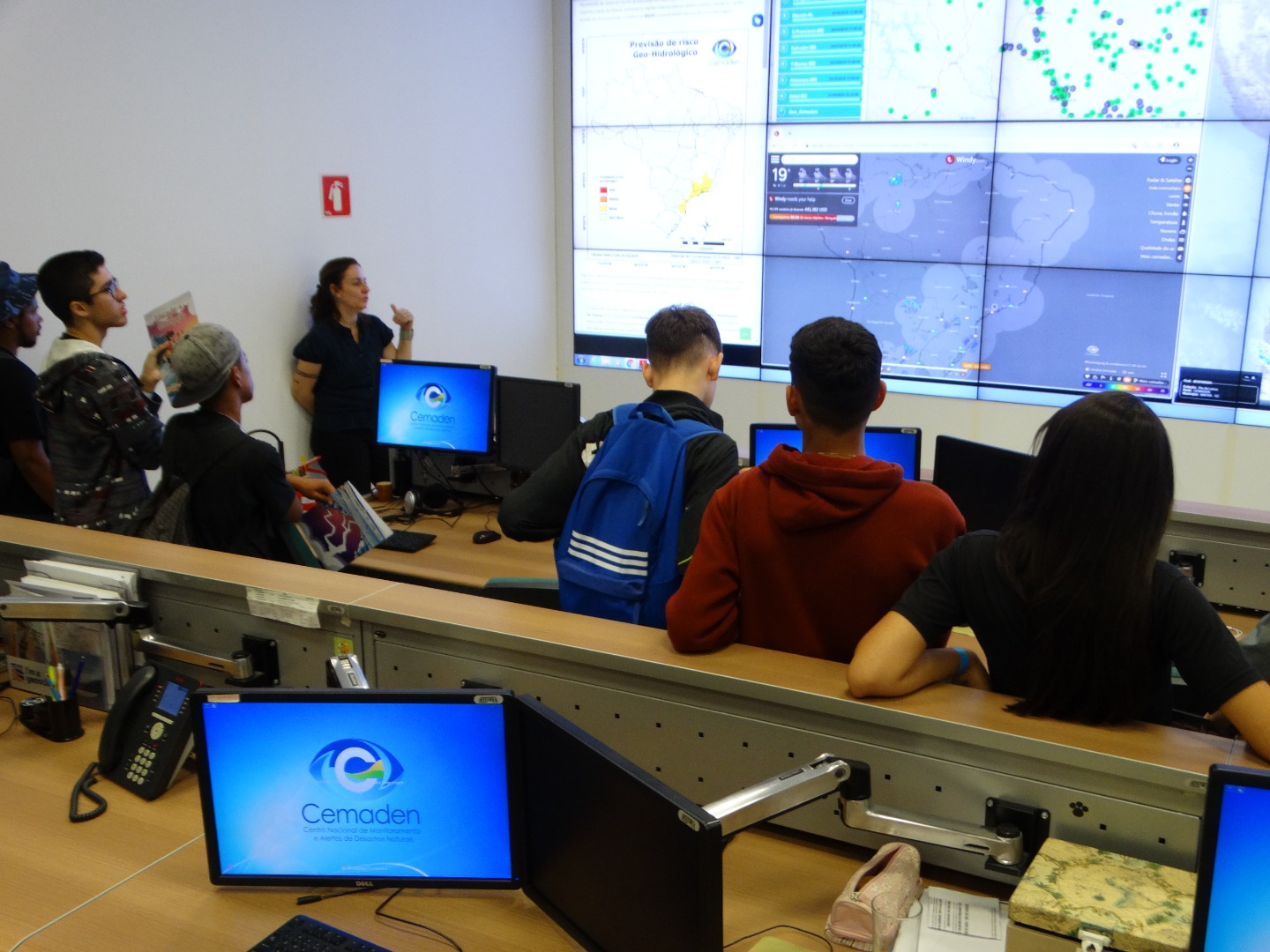 Outra visita realizada pelos alunos foi na Sala de Situação do Cemaden, acompanhados pelo pesquisador da área de Meteorologia do Cemaden, Giovanni Dolif, e pela tecnologista área de Desastres, Cláudia Linhares. Eles explicaram o processo de monitoramento dos 958 municípios prioritários com áreas de risco e sobre os profissionais de diversas áreas que trabalham no monitoramento e análise dos riscos, para emissão dos alertas.