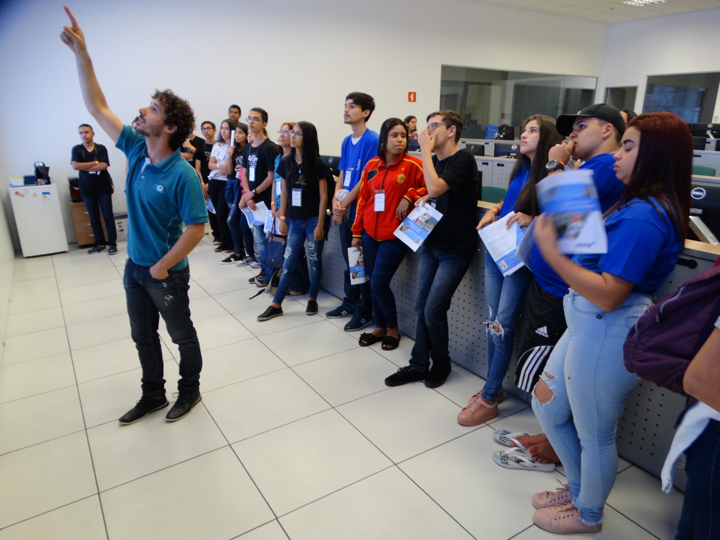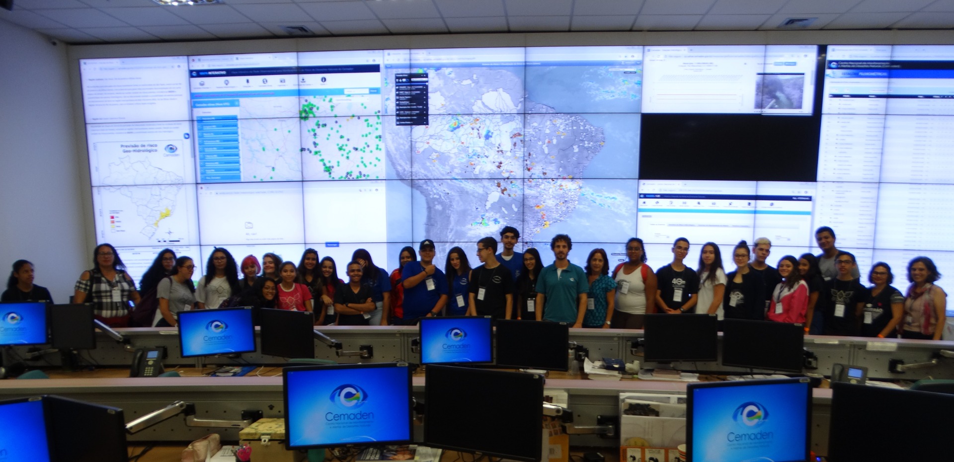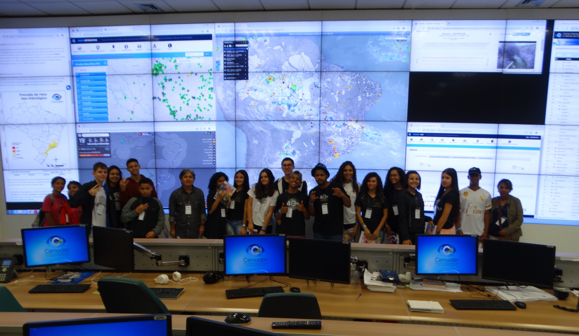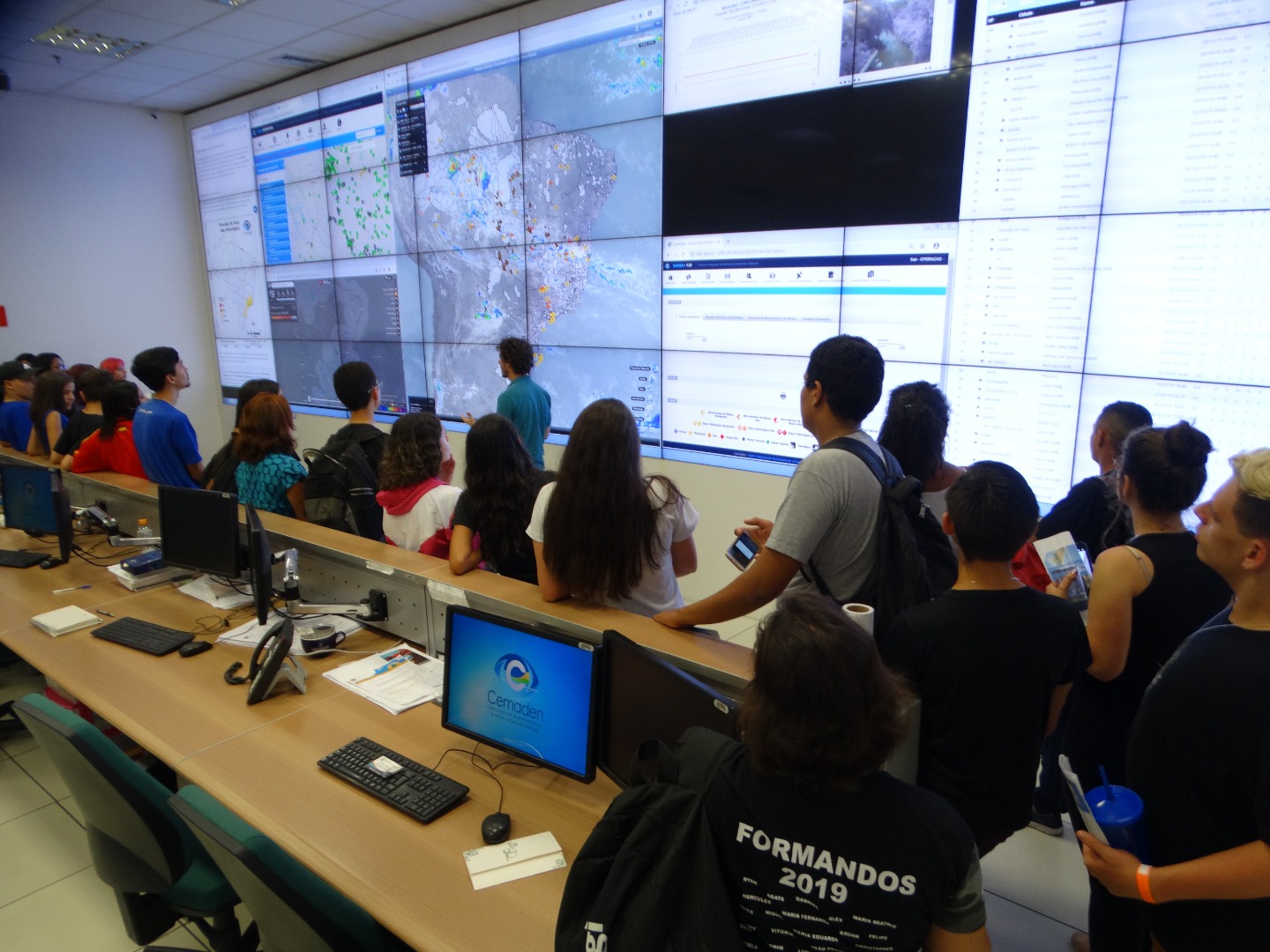 Outra visita realizada pelos alunos foi na Sala de Situação do Cemaden, acompanhados pelo pesquisador da área de Meteorologia do Cemaden, Giovanni Dolif, e pela tecnologista área de Desastres, Cláudia Linhares. Eles explicaram o processo de monitoramento dos 958 municípios prioritários com áreas de risco e sobre os profissionais de diversas áreas que trabalham no monitoramento e análise dos riscos, para emissão dos alertas.