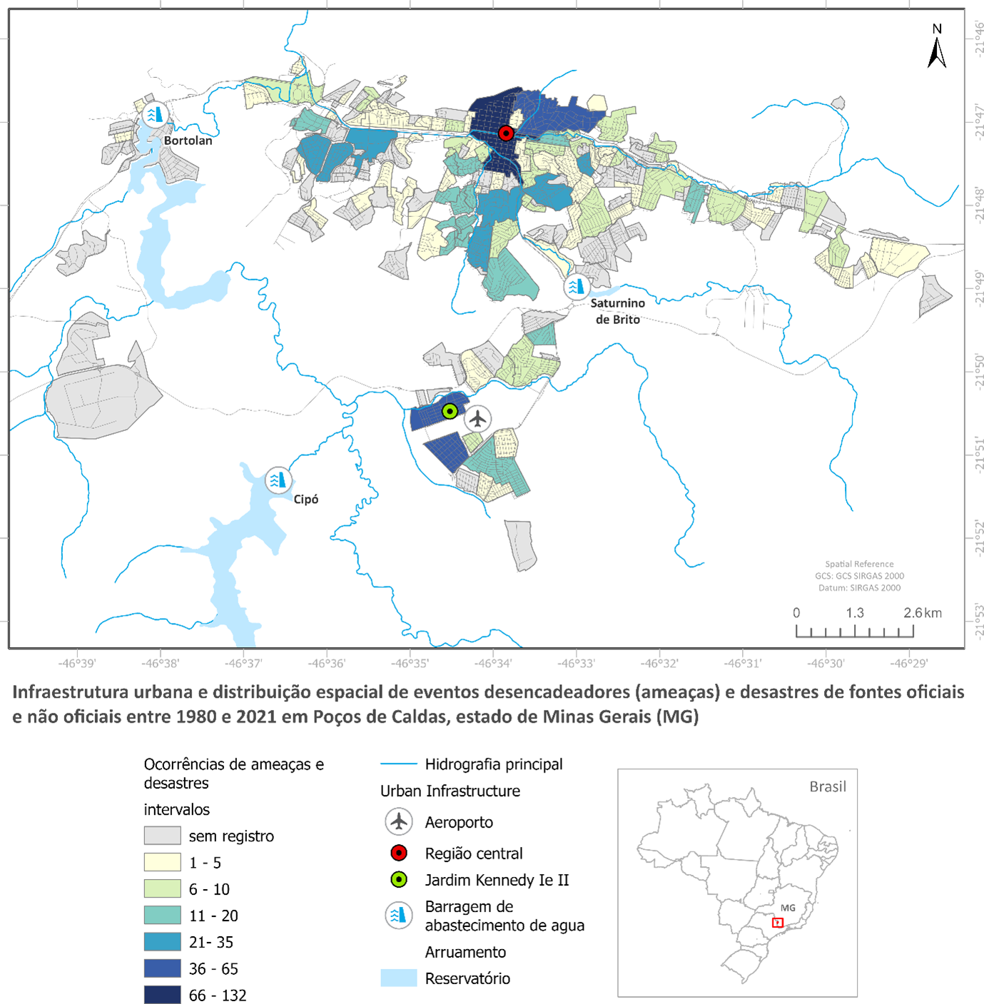 - Infraestrutura urbana e distribuição espacial de ameaças e desastres, entre 1980 e 2021, em Poços de Caldas-MG.