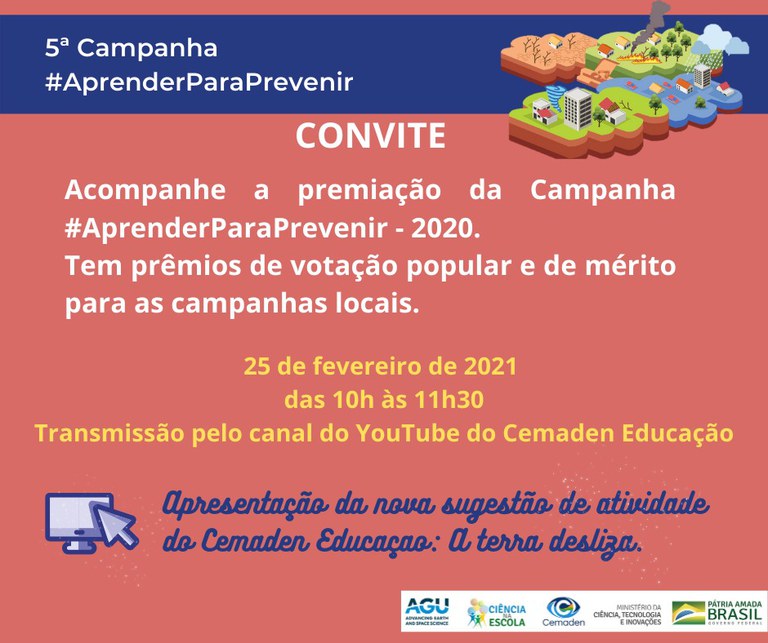 Será nesta quinta-feira (25), às 10 horas, a cerimônia de premiação das campanhas locais virtuais dos participantes da Campanha #AprenderParaPrevenir de 2020, transmitida ao vivo pelo Canal do Cemaden Educação no YouTube. Além de apresentar os participantes premiados por mérito e por votação popular, o evento também lançará a atividade da próxima campanha, de 2021, relacionada a escorregamento de terra (e deslizamentos).