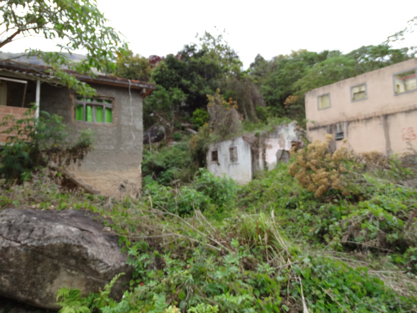 Casas destruídas na região de Posse e Campo Grande, em Teresópolis, com as marcas do desastre de 2011 e a identificação da interdição oficial (à direita). (Foto: Ascom-Cemaden)