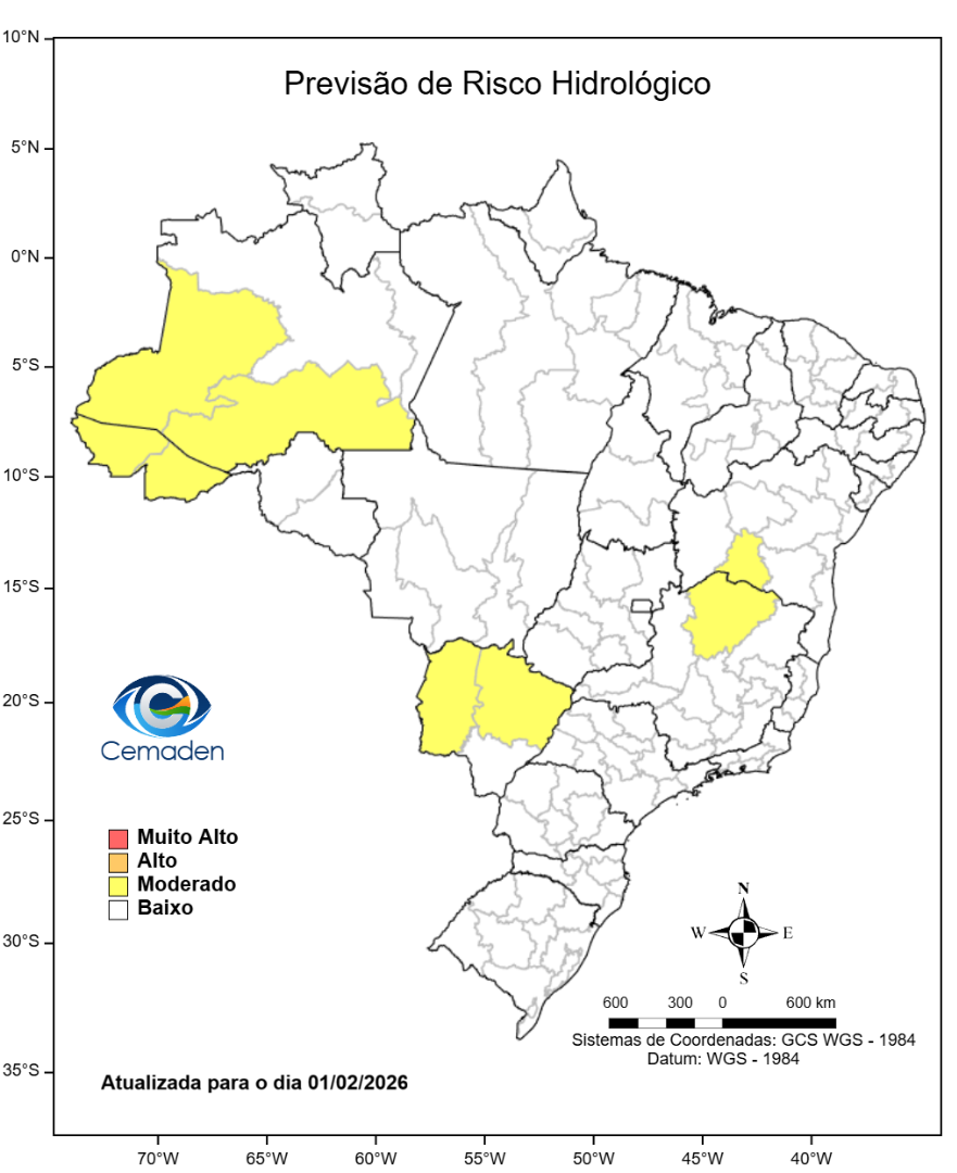 Neste domingo (01/02/2026), o cenário de risco de eventos geo-hidrológicos para as regiões do Brasil é apresentado a seguir: