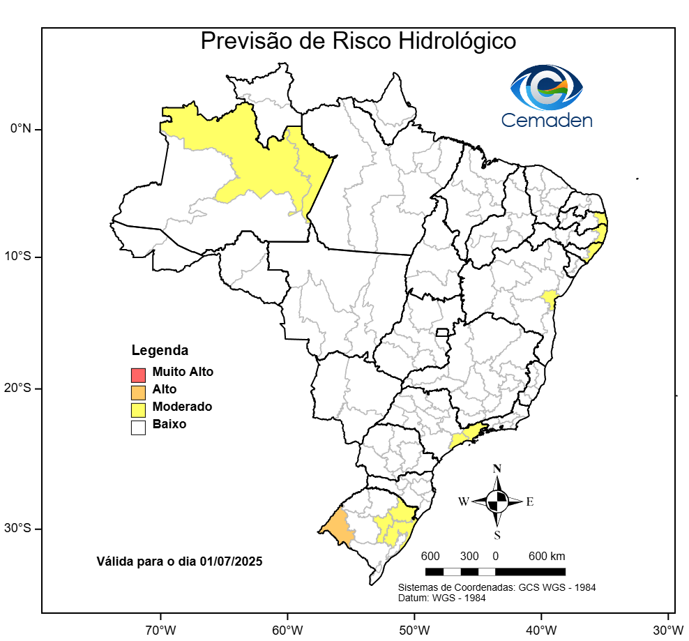 Nesta terça-feira (01/07/2025), o cenário de risco de eventos geo-hidrológicos para as regiões do Brasil é apresentado a seguir: