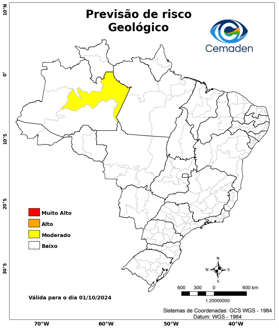 Nesta terça-feira (01/10/2024), o cenário de risco de eventos geo-hidrológicos para as mesorregiões do Brasil é apresentado a seguir:
