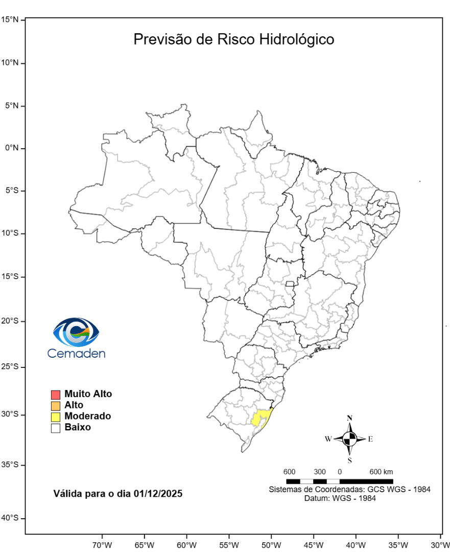 Figura 1 - Possibilidade de ocorrência de eventos hidrológicos em ao menos um município das Regiões Geográficas Intermediárias indicadas. Este mapa é elaborado por uma equipe multidisciplinar, levando em consideração os cenários de riscos hidrológicos atuais somados à previsão de chuva.