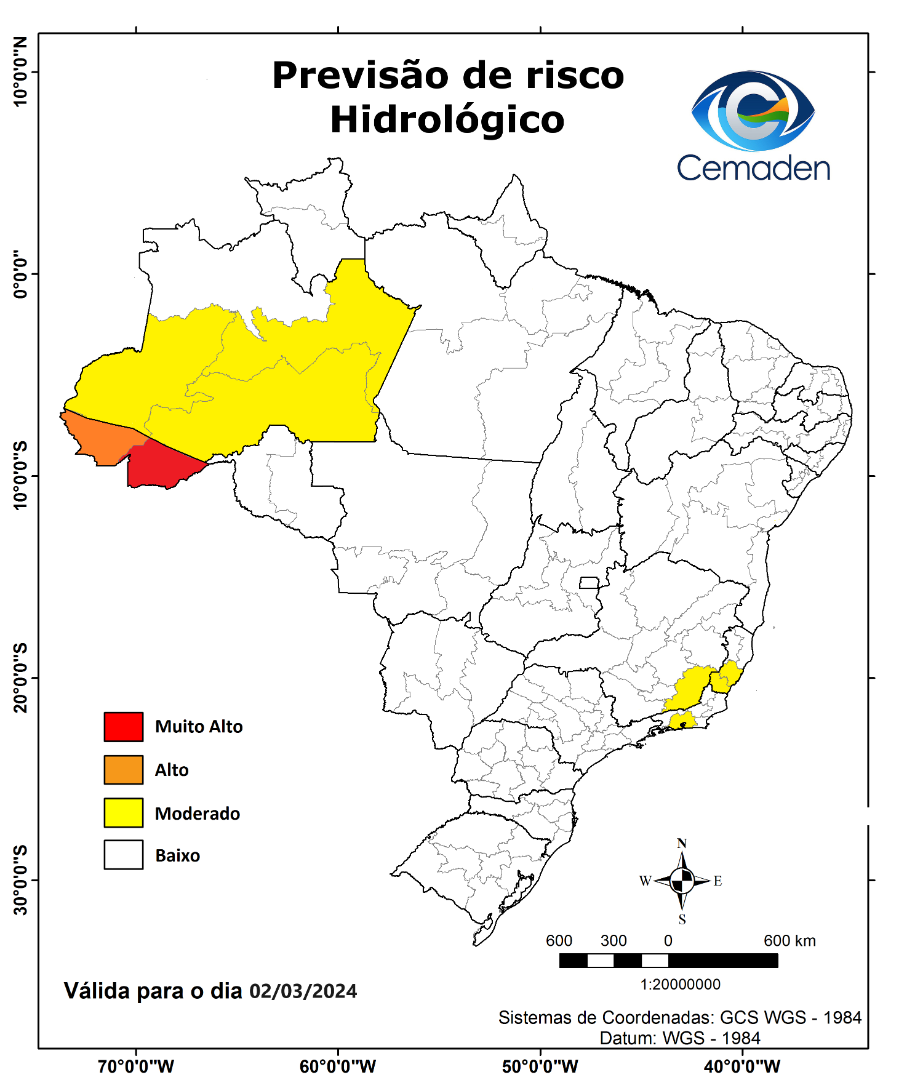 Considera-se ALTA a possibilidade de ocorrência de eventos hidrológicos no estado do Acre, devido à propagação das ondas de cheia dos rios Juruá, Tarauacá e Envira, somadas à possibilidade de pancadas de chuva localizadas, principalmente na porção Oeste do estado (Figura 1).